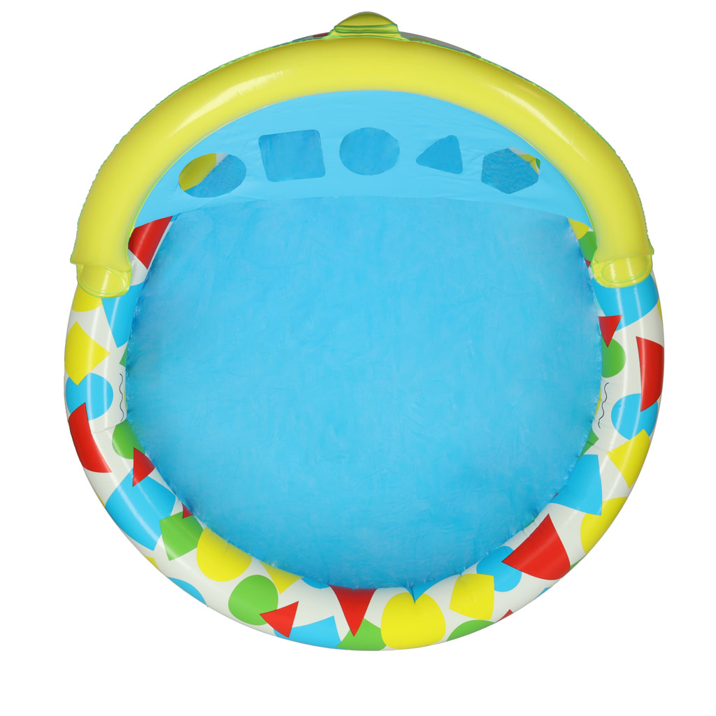 Basen wyposażony jest w miękką poduszkę oraz sorter kształtów z kolorowymi klockami, które rozwijają zdolności manualne dziecka i urozmaicają zabawę. Produkt wykonany jest z trwałego materiału PVC, który zapewnia odporność na uszkodzenia i długie użytkowanie.