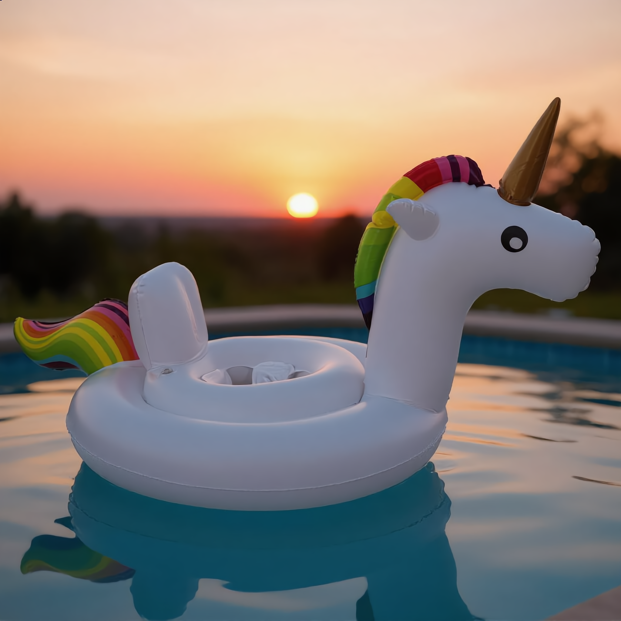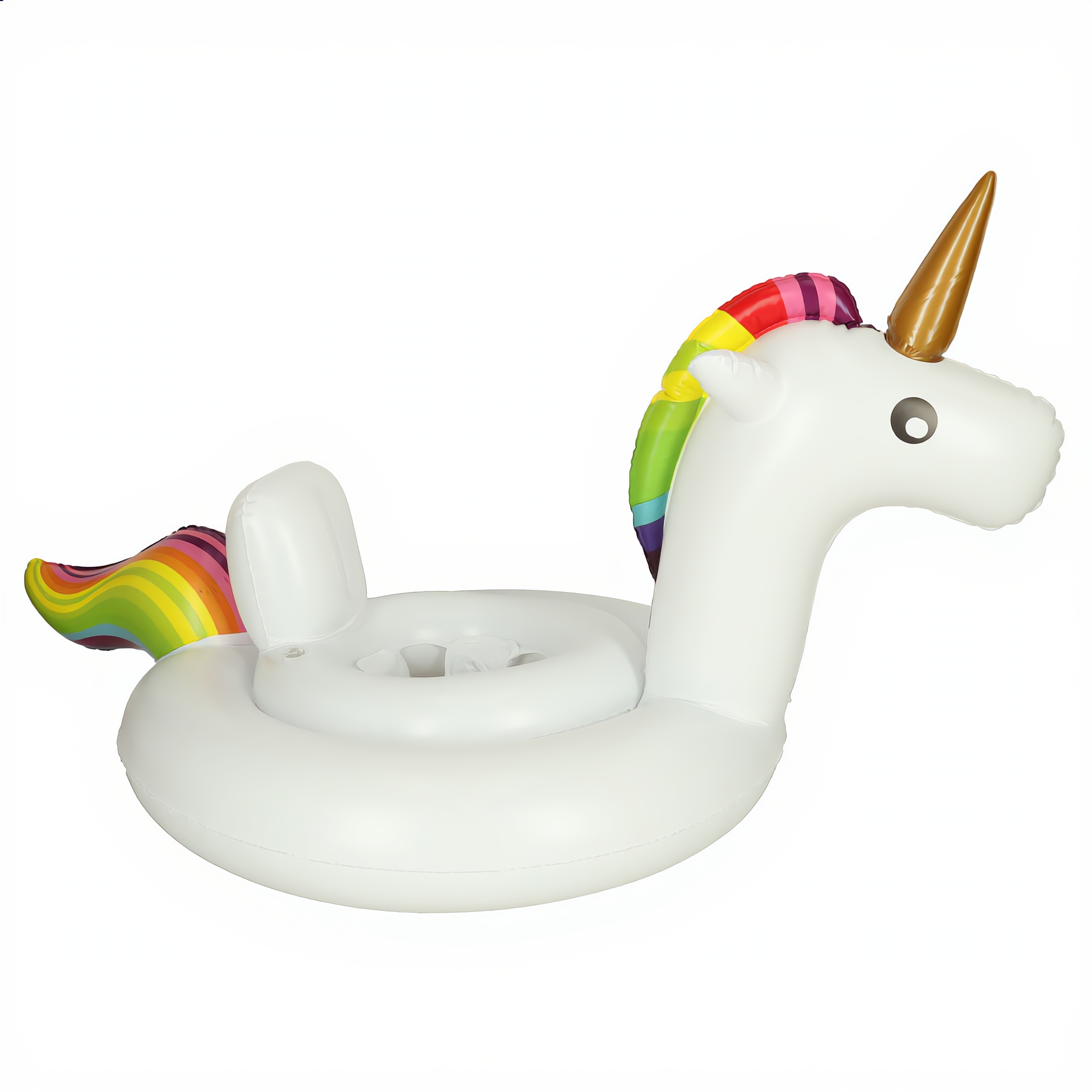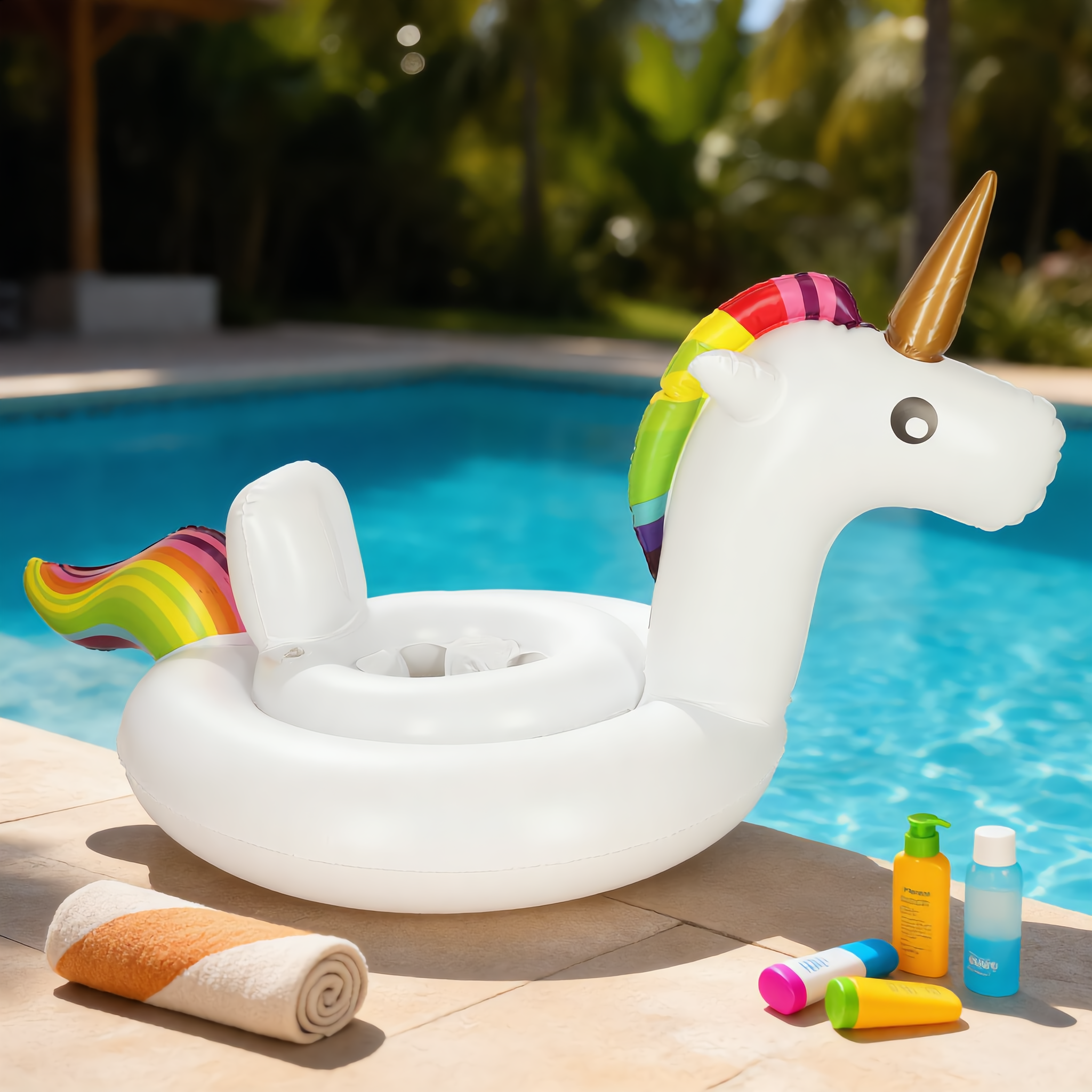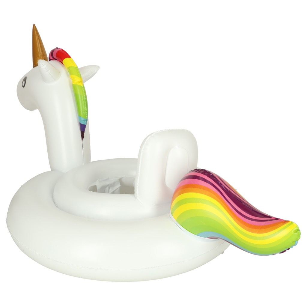 Dmuchane kółko z siedziskiem w kształcie jednorożca zapewnia bezpieczeństwo i wygodę podczas zabawy w wodzie. Idealne dla dzieci w wieku 1–3 lat.