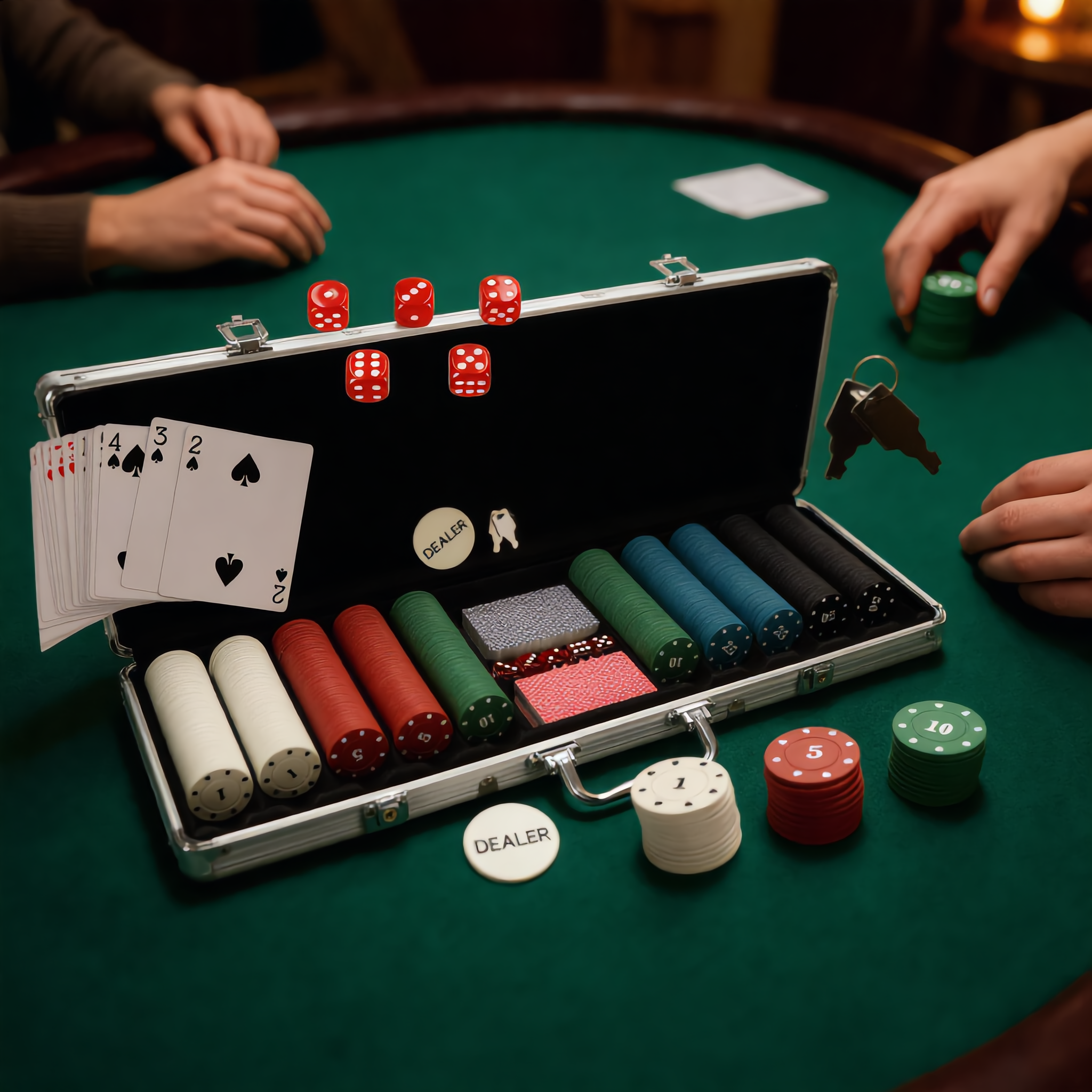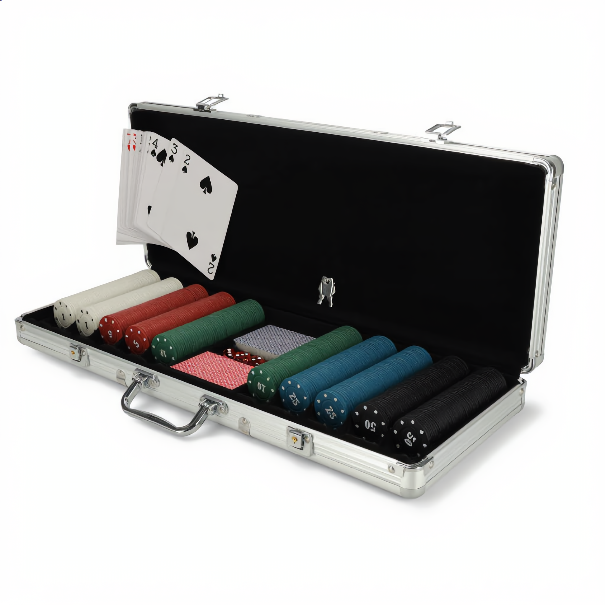 Zestaw jest gotowy do gry od razu po otwarciu walizki. Wystarczy rozłożyć żetony i karty, aby rozpocząć rozgrywkę w pokera Texas Hold’em lub inne popularne gry karciane.